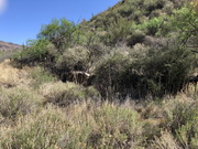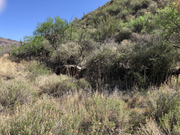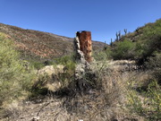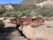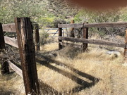 We walked past the 6L gate and past the Newspaper Rock for another 1 - 1.5 miles. We encountered an overturned truck, then finally the actual Ranch site. It was an amazingly open area surrounded by a wire fence - the fence was above a stone wall that encompassed the area. We saw wooden and stone structures from the old Ranch. The area was lush and green - a big contrast to the dry desert surrounding it. The round trip was about 10 miles.